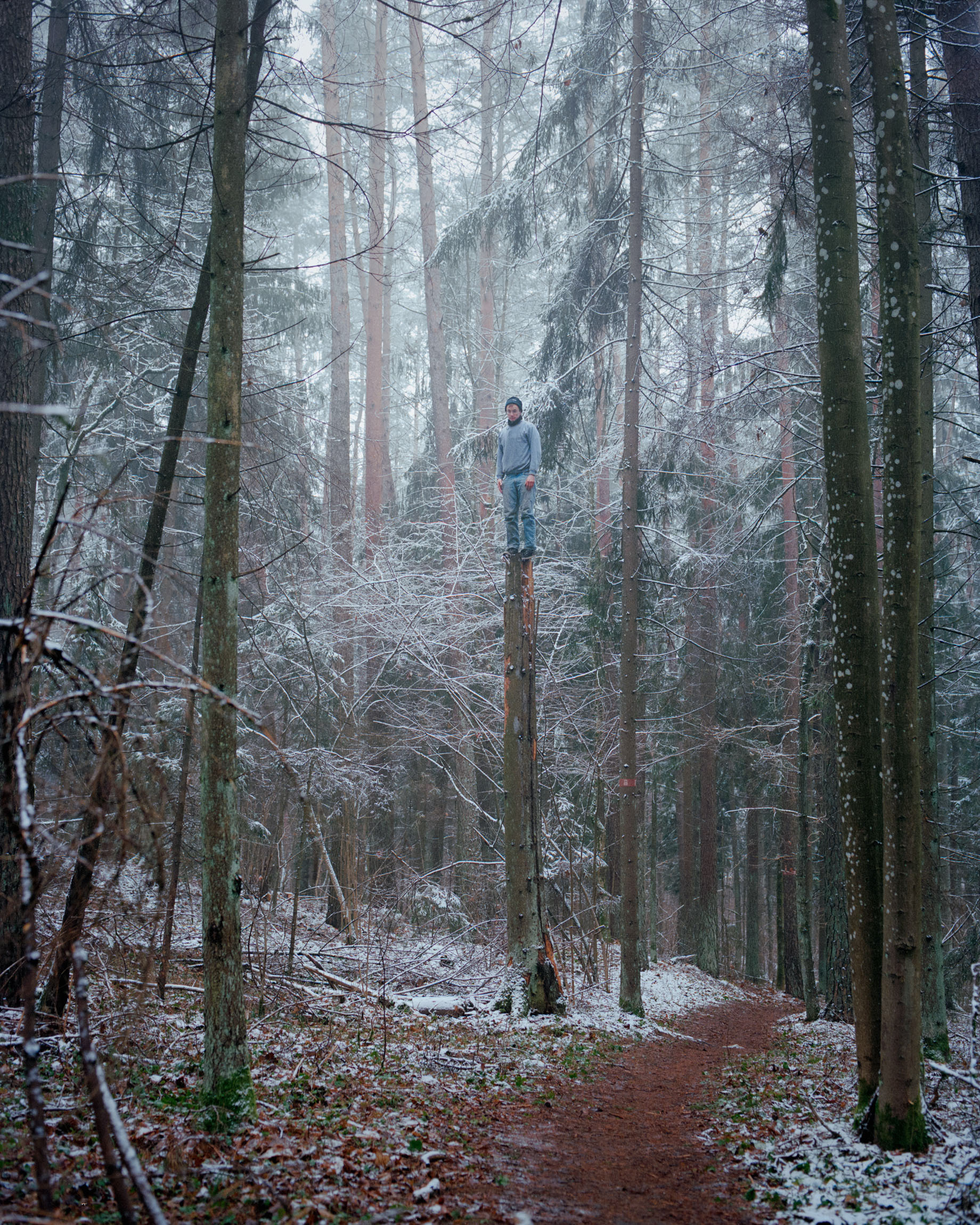Woodstatues (liet. Miško statulos) is Andrej Polukord's photography/performance project which explores and documents the tree trunks left behind by loggers in landscapes once covered by old-growth forests. To the artist, these stumps evoke pedestals for the monuments often placed in empty city squares. Here in the woods, however, they form a monument to anti-ecology. They appear as hermetic witnesses to a policy of quick money-making through the deforestation of thousands of acres by the logging industry. Photographs were taken on medium format film by Lina Margaitytė and Marius Krivičius.